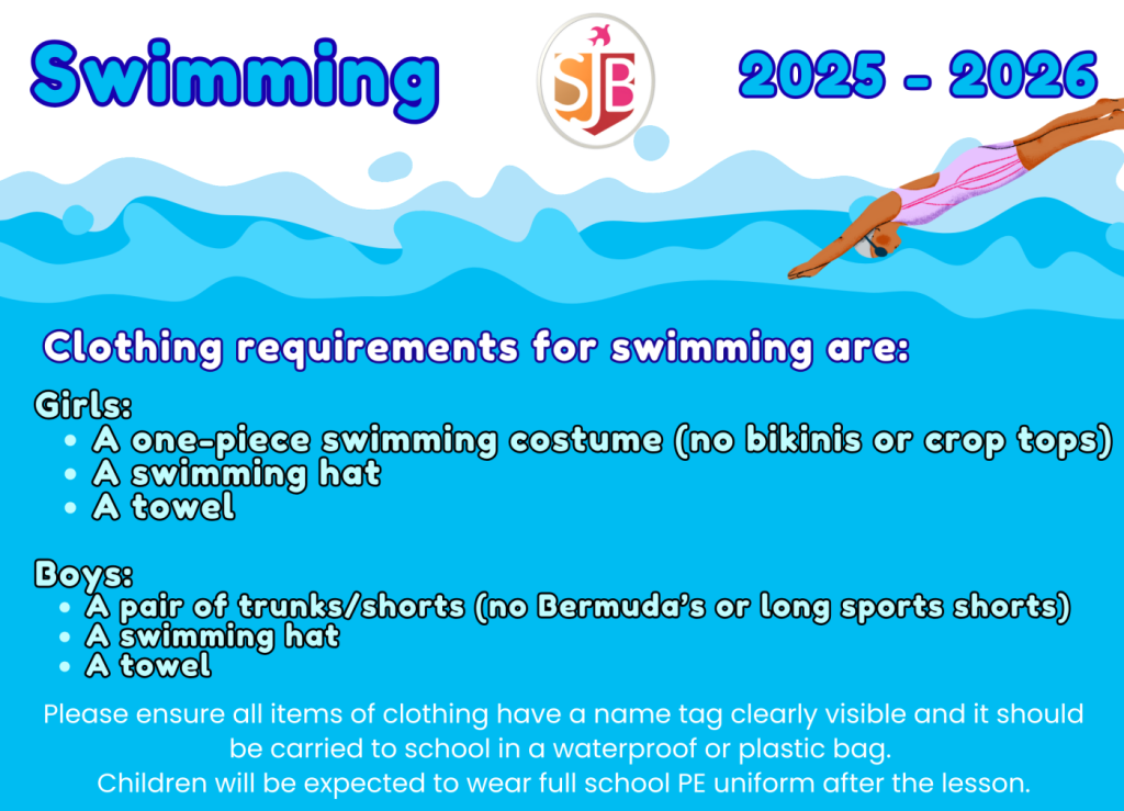 Swimming is an essential life skill and a compulsory part of the National Curriculum. It not only supports children’s health and safety but also builds their confidence in the water. Most vitally, it may also be a future life-saving skill. Over the course of the year, all year groups from Reception to Year 6 will have swimming lessons as part of their curriculum entitlement. Pupils will need to bring a swimming costume, swimming hat and towel with them to school on these allocated days. This half term it is Year 6 but please see the poster below for information about when it is your child’s turn.